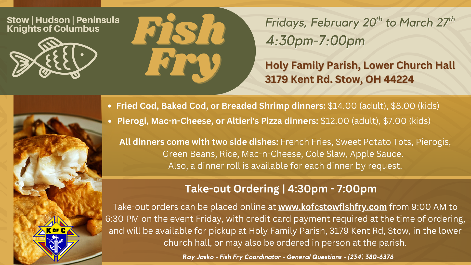 We’re excited to welcome back the Knights of Columbus Fish Fry! Join our parish community this Lent for good food, fellowship, and a shared tradition.