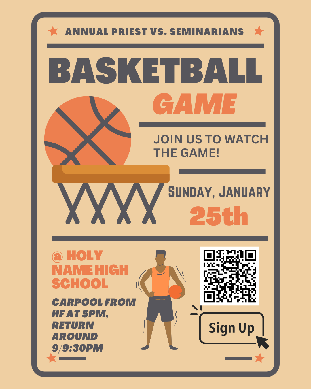Join us on Sunday, January 25th for the annual priest vs. seminarian basketball game. Leaving Holy Family 5pm, returning around 9:30pm. Transportation provided, parent permission form required.