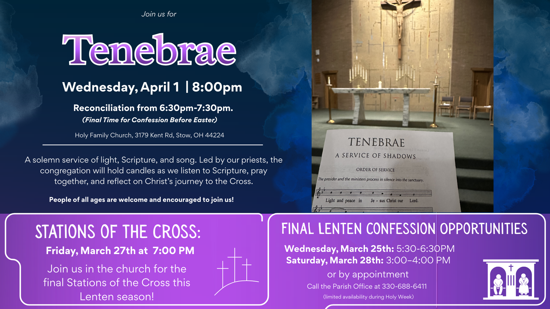 Join us this Lenten season for prayer, penance, and reflection as we journey with Christ toward Easter. Below is our complete schedule of events and devotions at Holy Family Parish.
